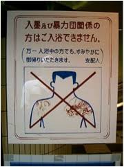 Some public baths have signs refusing entry for people with tattoos. However, one may be allowed in if the tattoos are not too obvious. If one ventures to a public bathing place that is publicly owned, this should not present a problem as they have a duty to let all tax-paying citizens in. The original reason behind the ban was to keep out the yakuza.